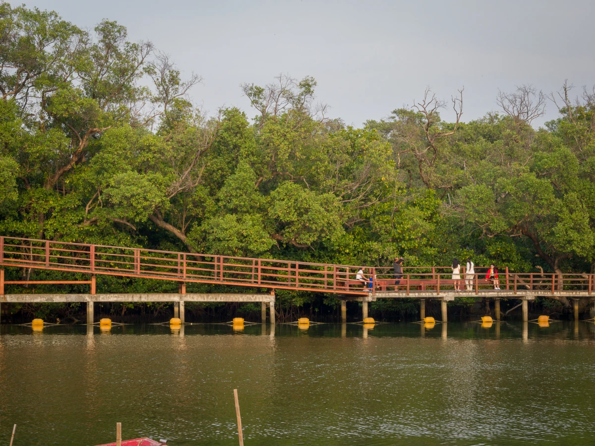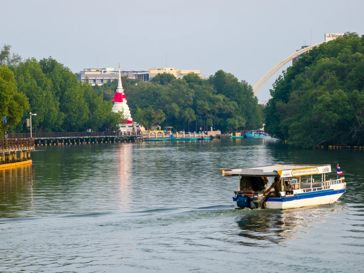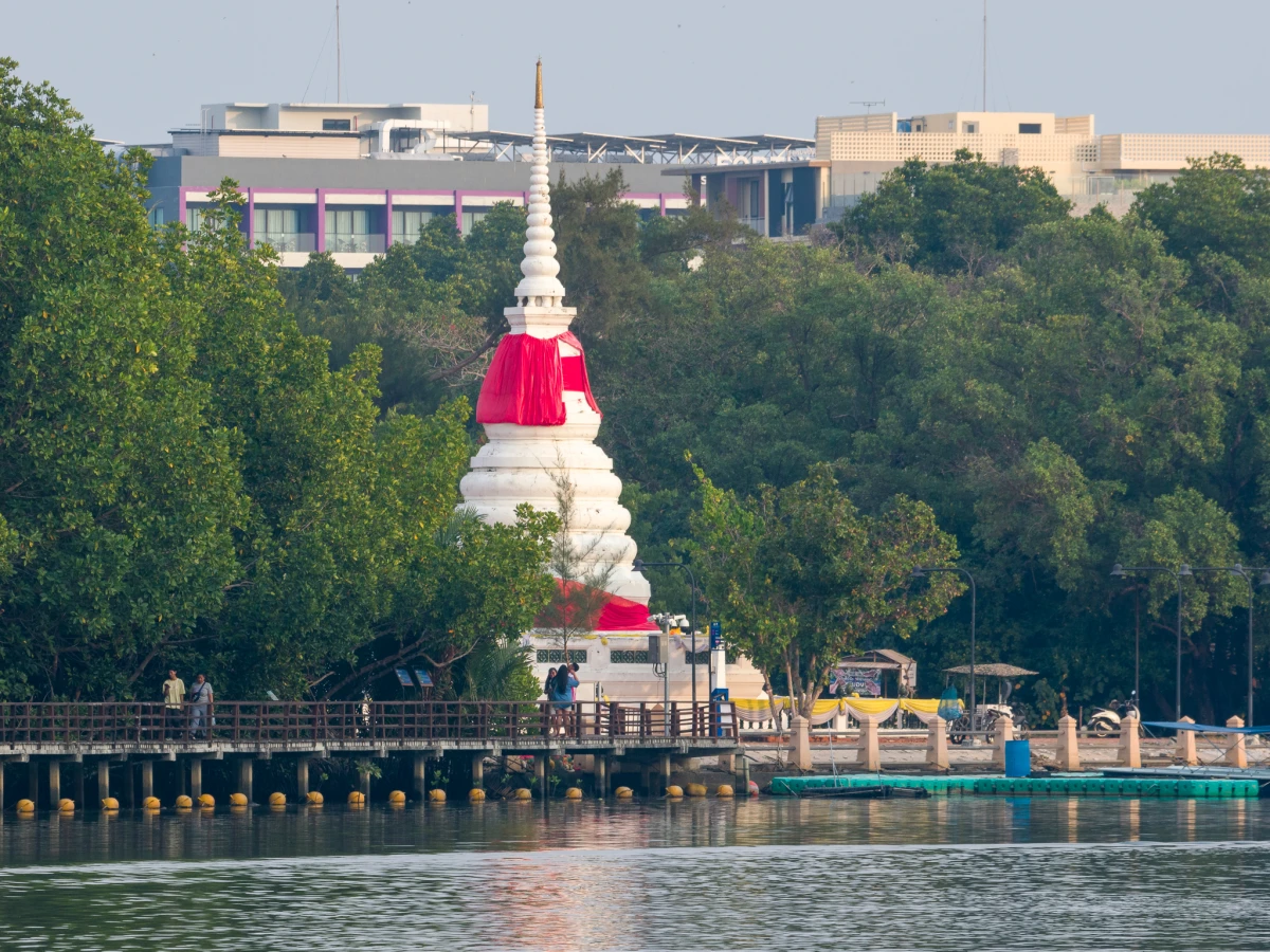 ก่อนจะโบกมือลาระยอง เราแวะไปที่ พระเจดีย์กลางน้ำ ปูชนียสถานคู่เมืองที่ตั้งโดดเด่นอยู่บนเกาะกลางแม่น้ำระยอง การเดินข้ามสะพานไม้ที่ทอดยาวขนานไปกับป่าโกงกางสีเขียวสด เพื่อไปกราบสักการะเจดีย์สีขาวสะอาดตา ลมแม่น้ำที่พัดเอื่อยๆ ผสมกับกลิ่นอายประวัติศาสตร์ ทำให้เราเห็นภาพระยองในมุมที่ลึกซึ้งกว่าเดิม